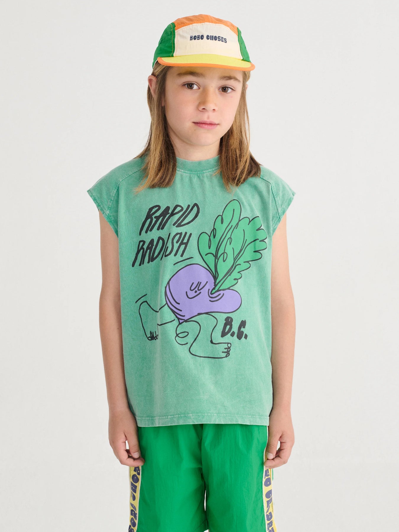 Green t-shirt. Sleeveless design, loose fit, and round neck. Made in Spain.
