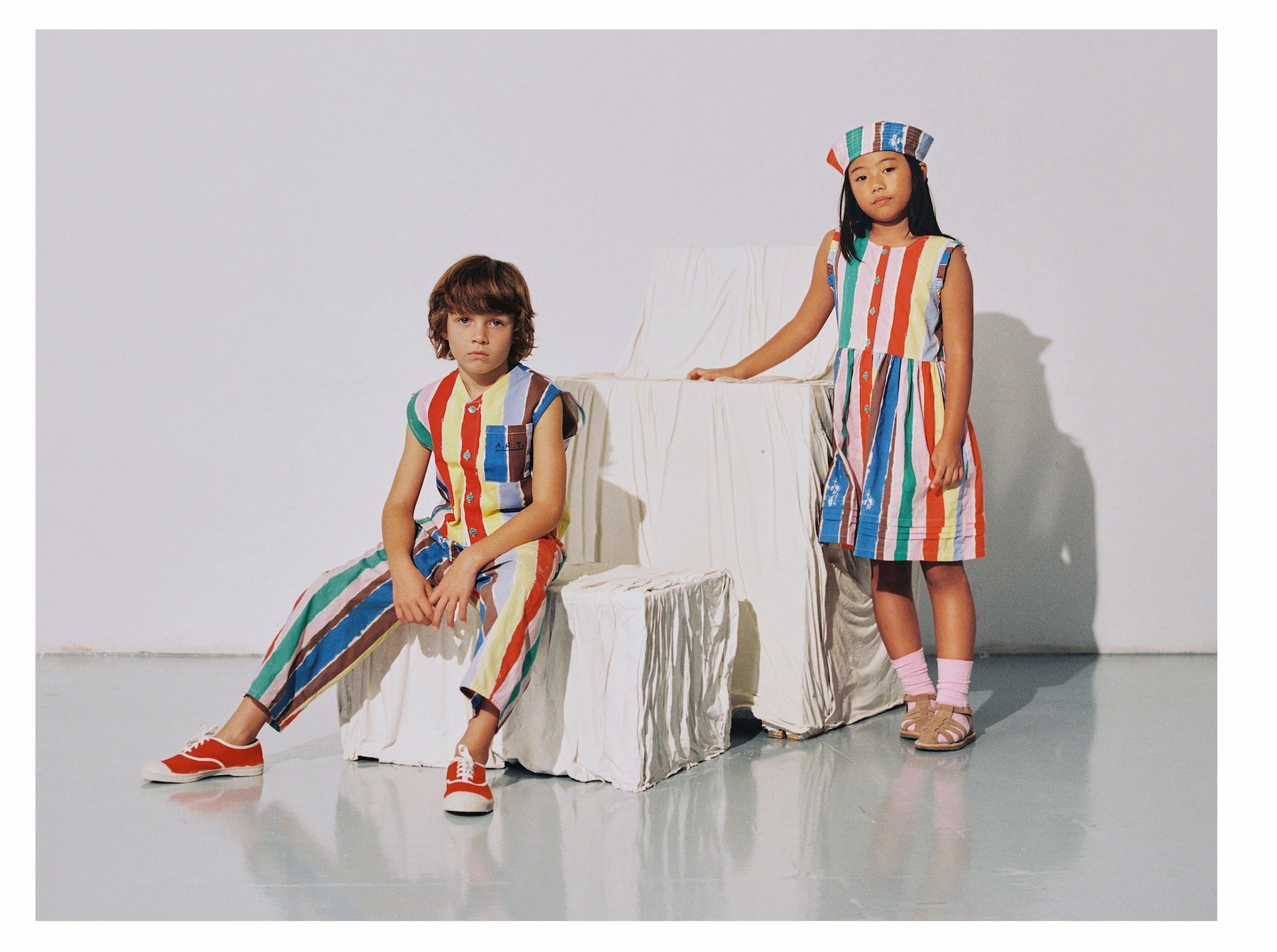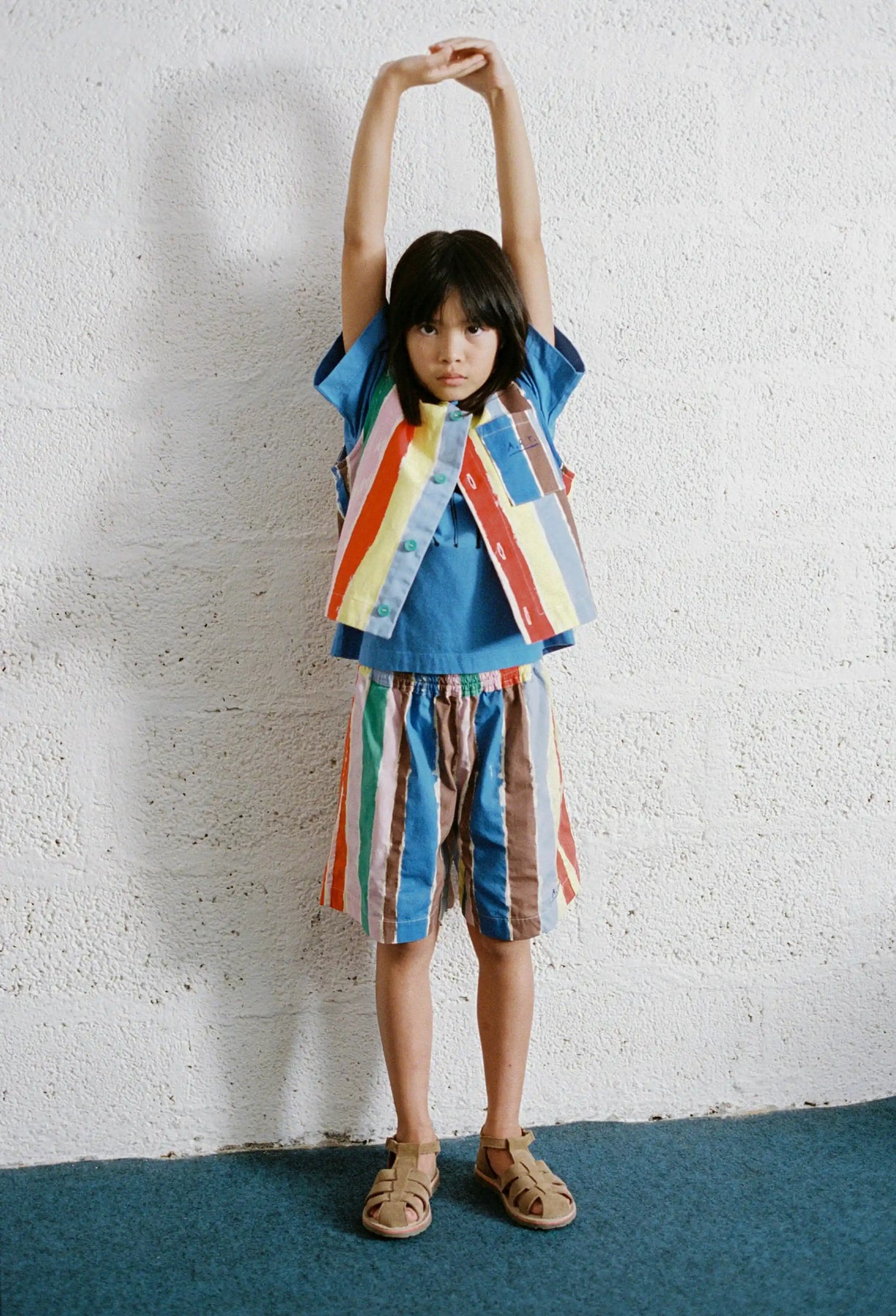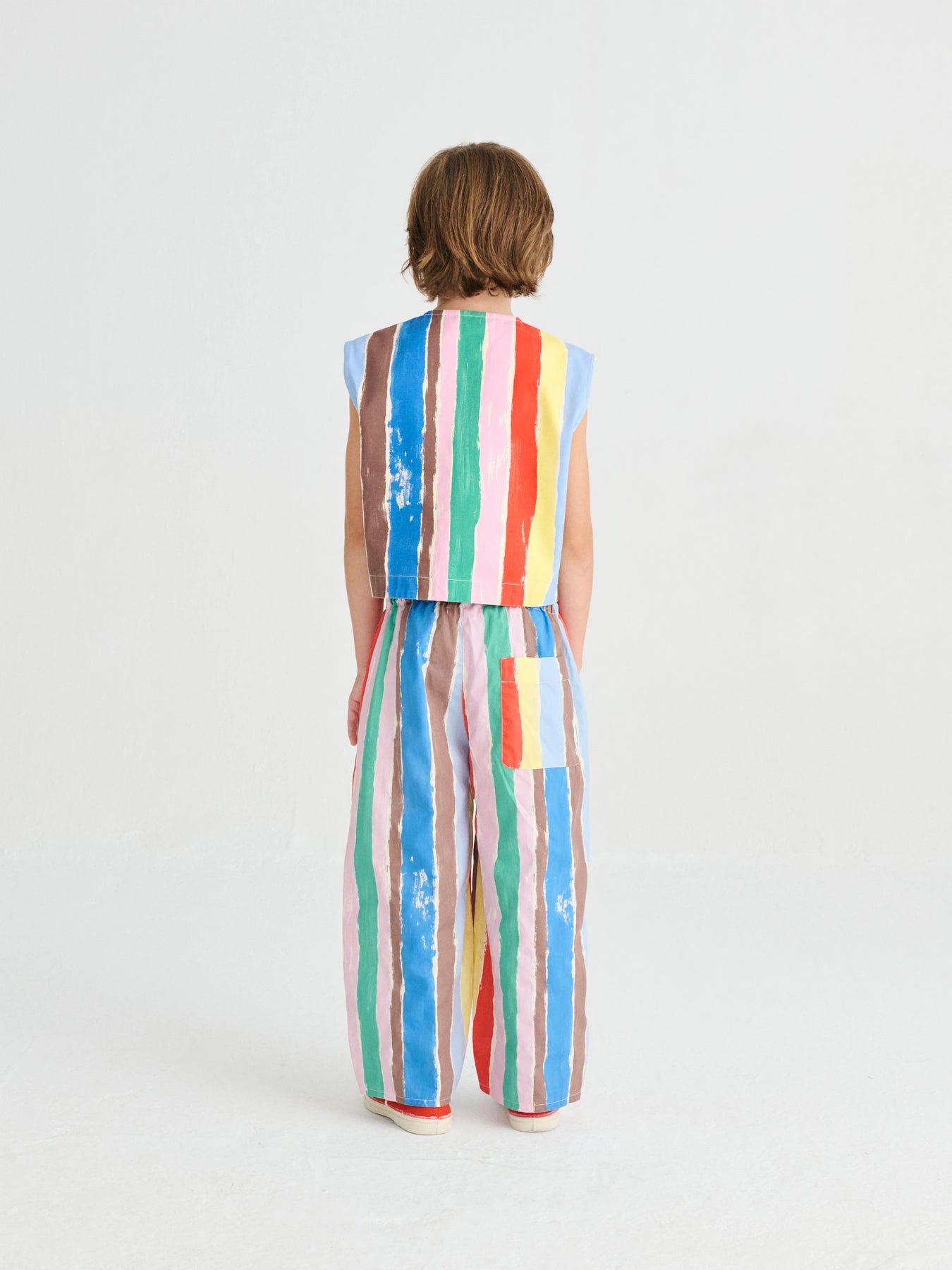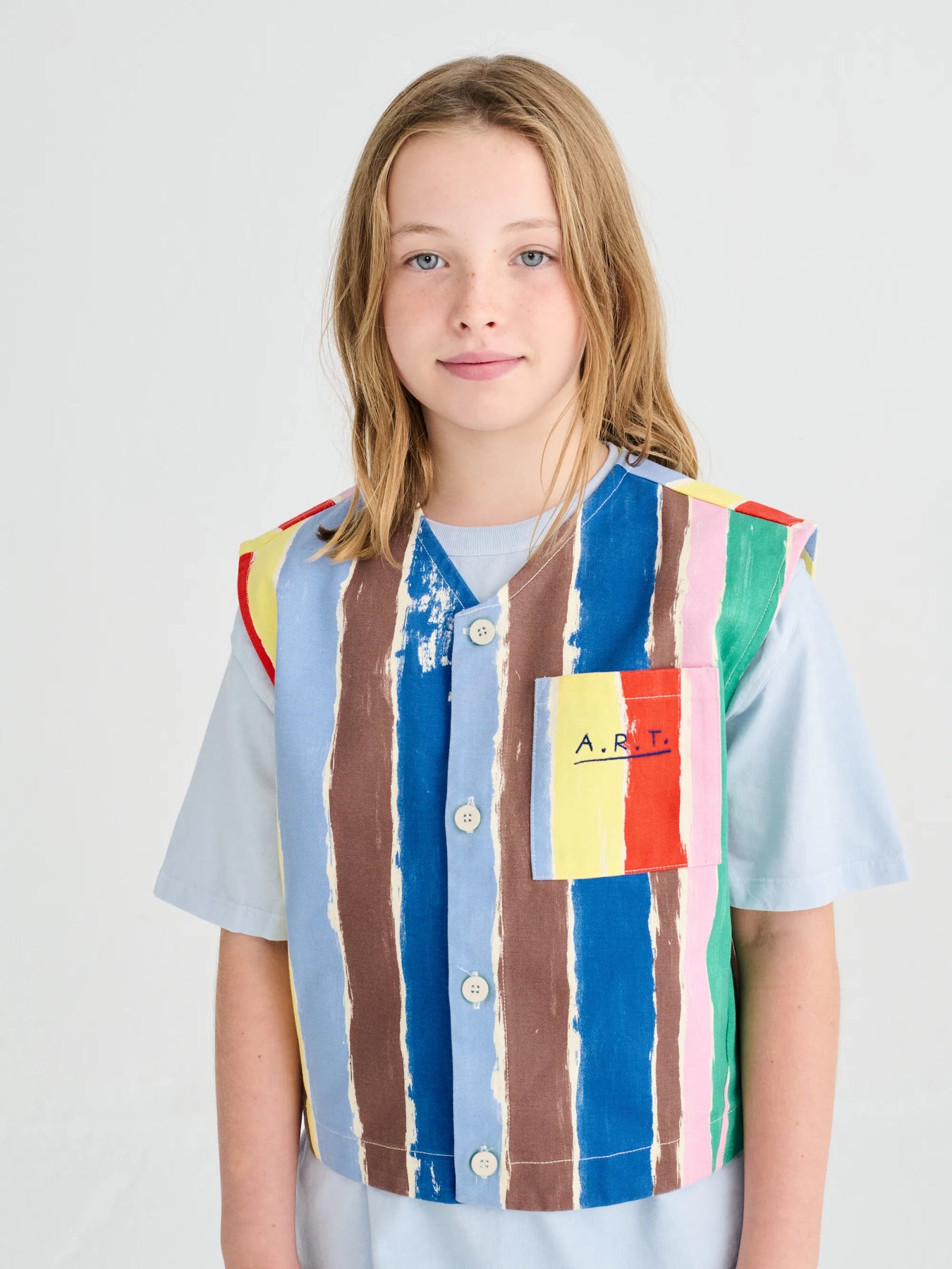 The Strokes vest is made of 100% BCI cotton and features a vibrant striped pattern that evokes the brushstrokes of the painter. It has a V-neck and a front button closure. It has a loose fit.