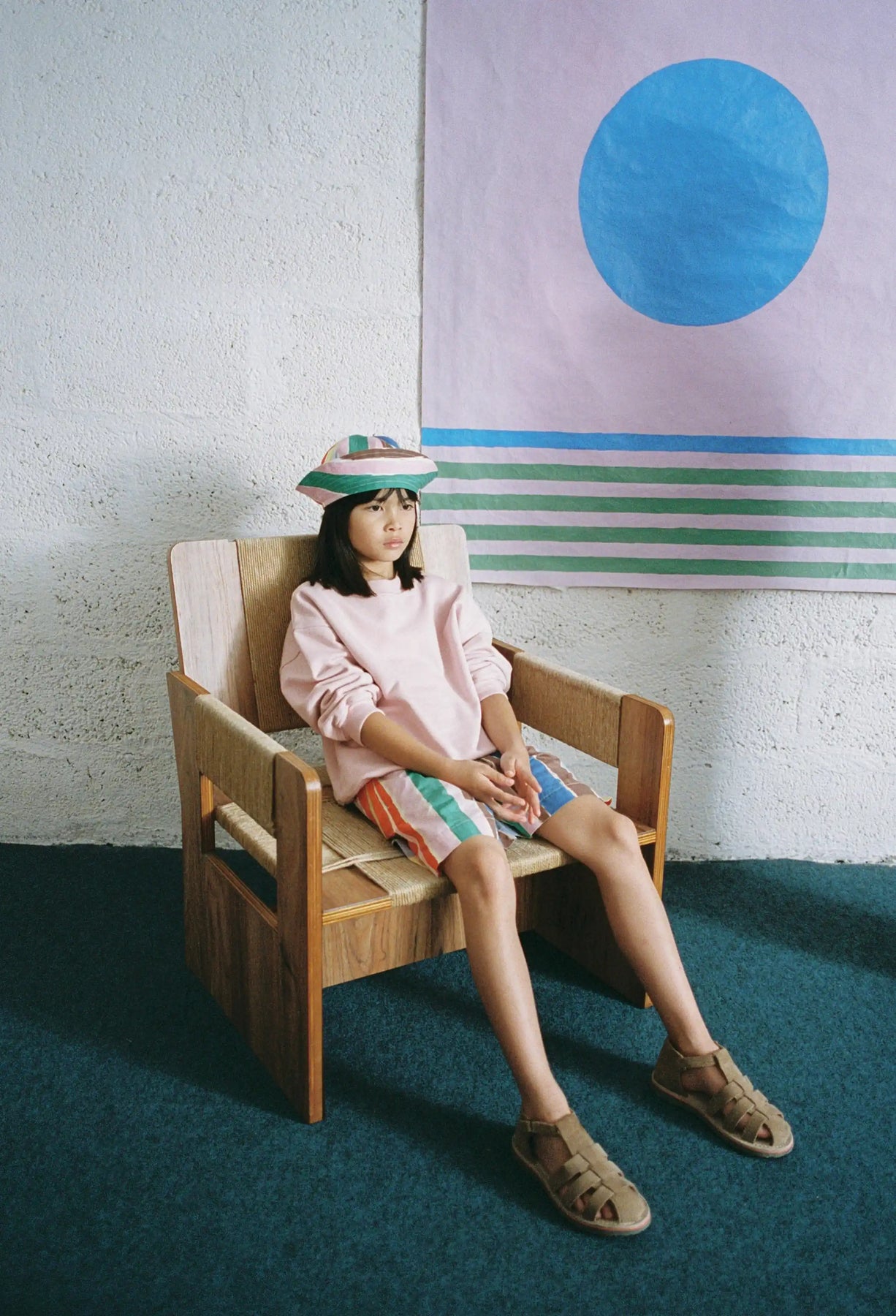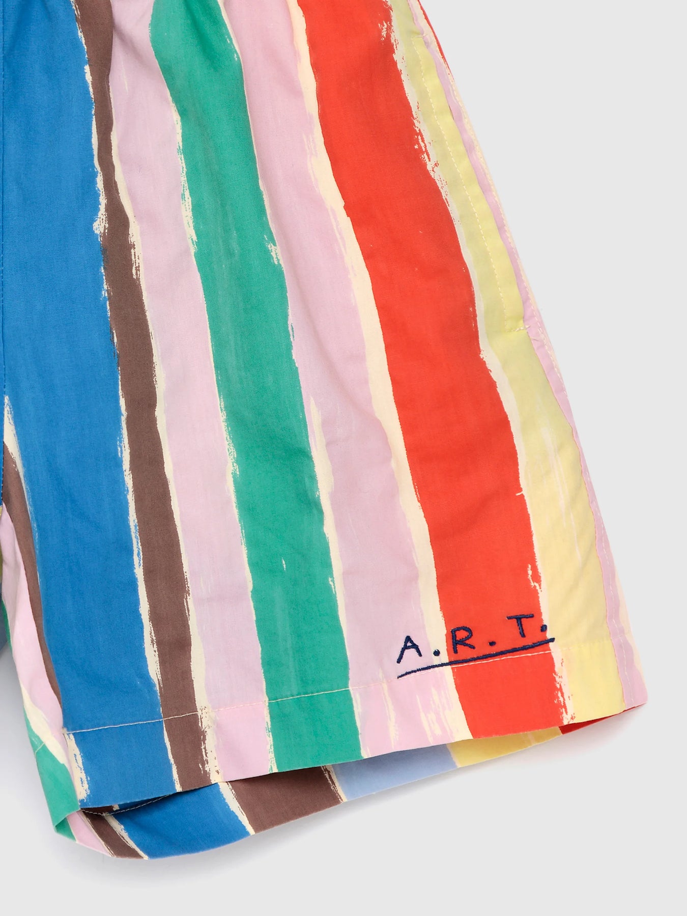 The Strokes shorts are made from 100% organic cotton and feature a vibrant striped pattern that evokes the brushstrokes of the painter. They have an elastic waistband, side pockets, and a loose inseam. They have a relaxed fit.
