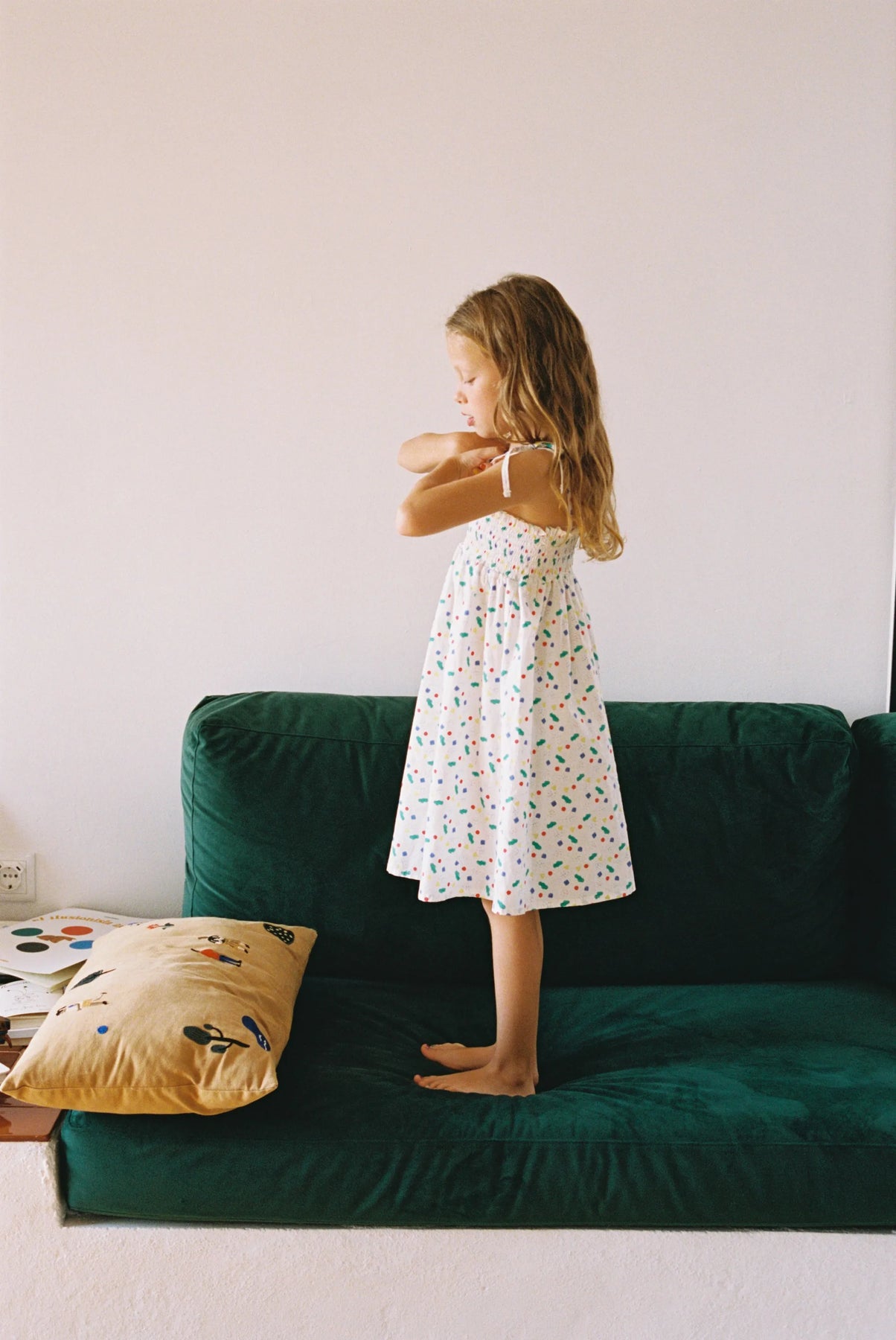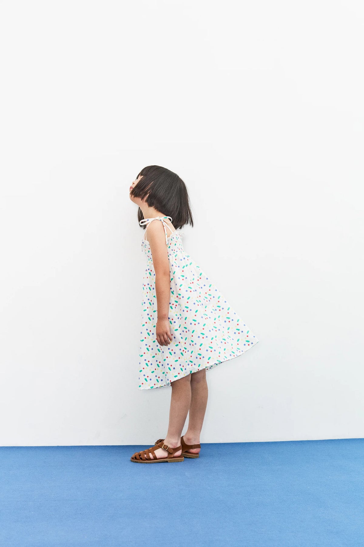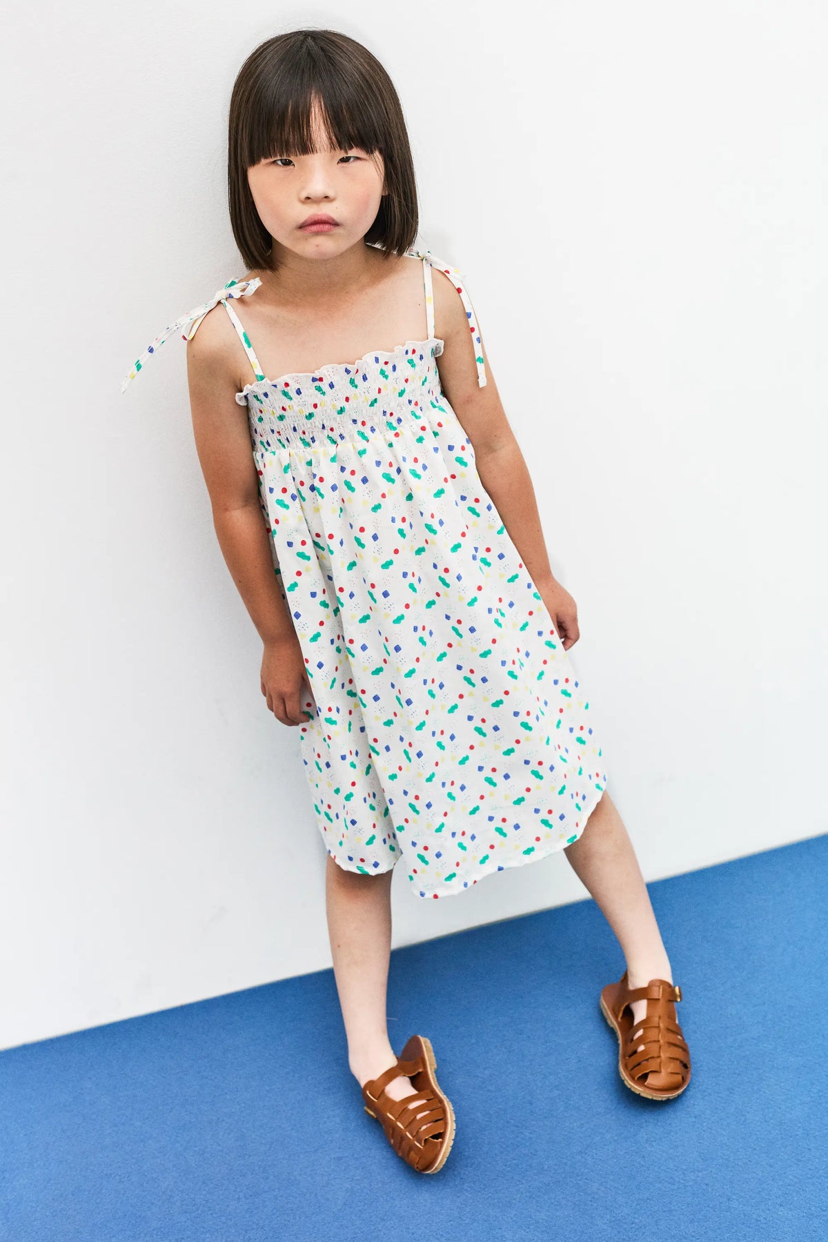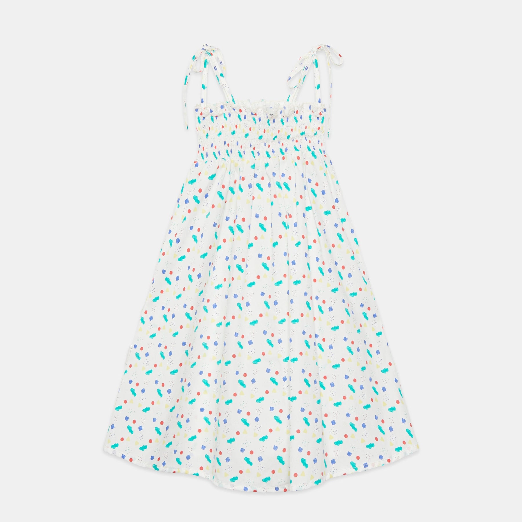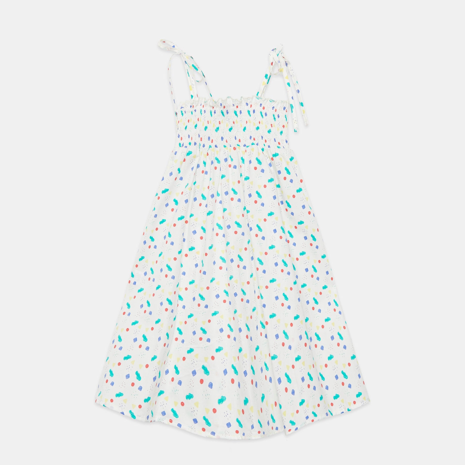 White strap dress with small shapes of colors.
