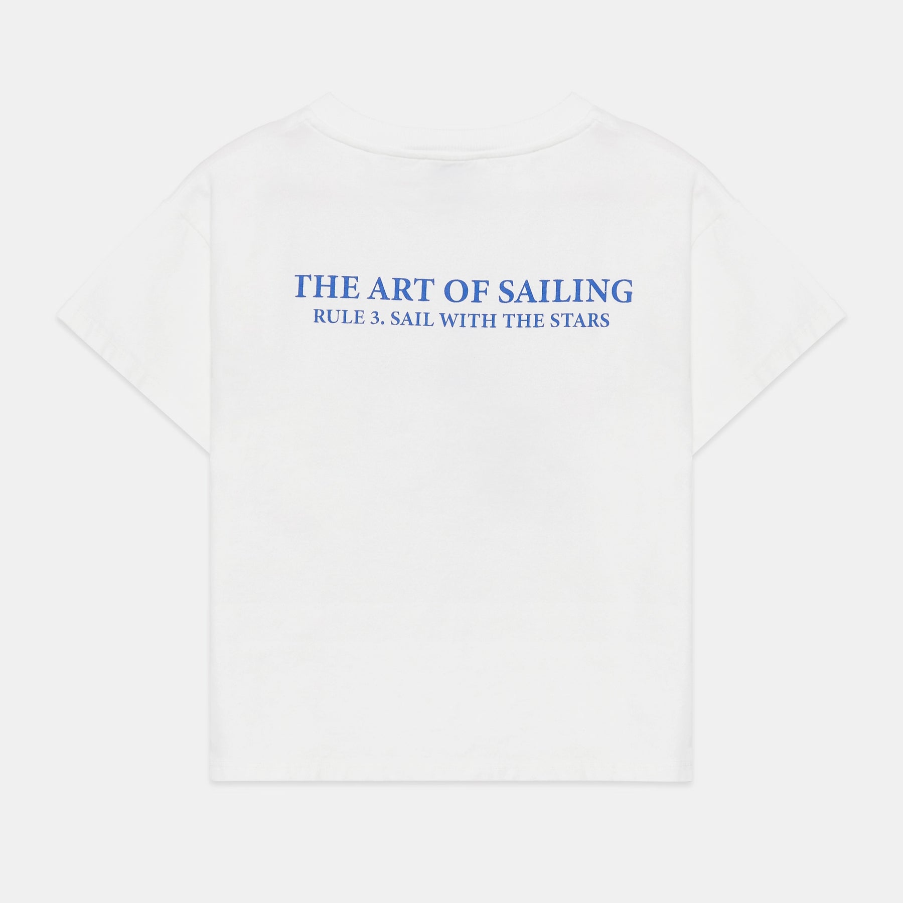 White t-shirt with a print of a blue little boat.